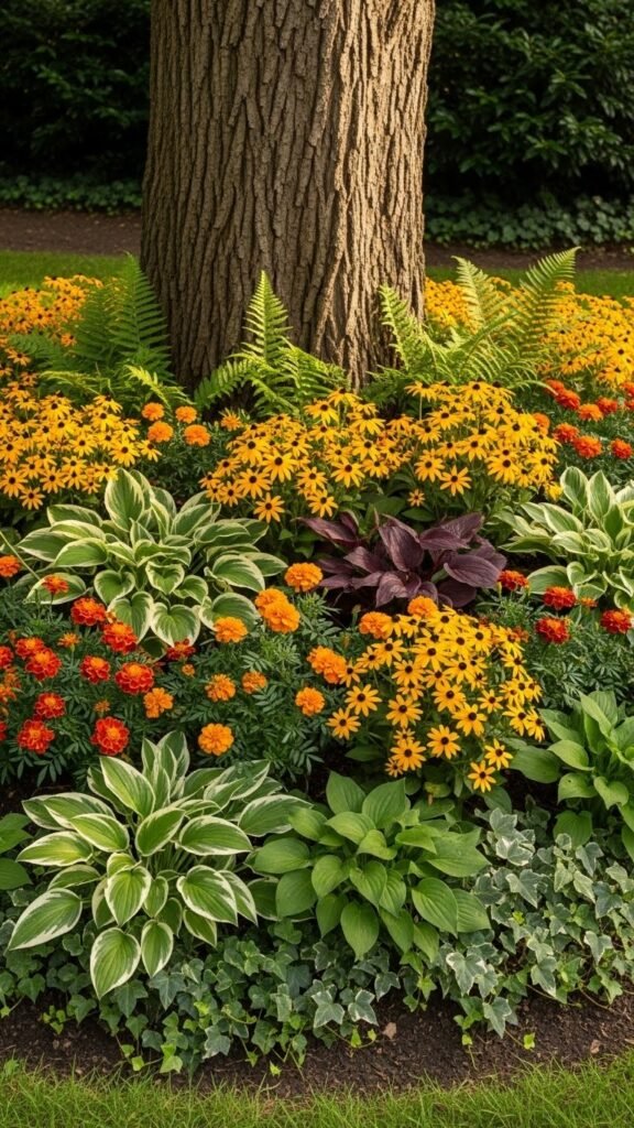 A big tree becomes even more beautiful when encircled by bold, colorful flowers like marigolds and black-eyed Susans. Adding foliage plants enhances depth and makes the space feel warm and welcoming.