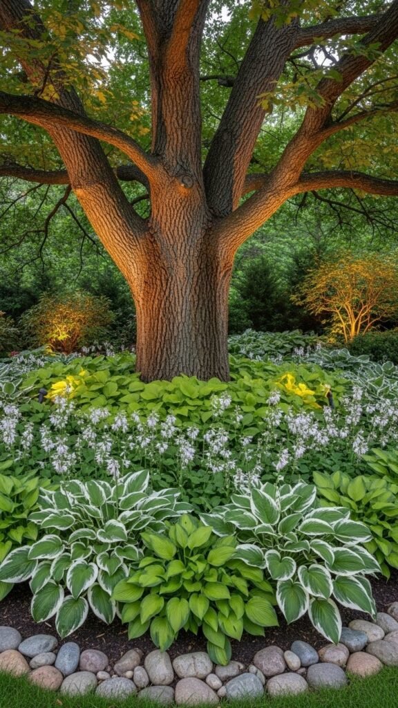 For a calm, peaceful design, surround your tree with large clumps of hostas and subtle white blooms. Add natural stone edging to keep everything neat, and mix in shade plants to form a soothing, layered landscape.