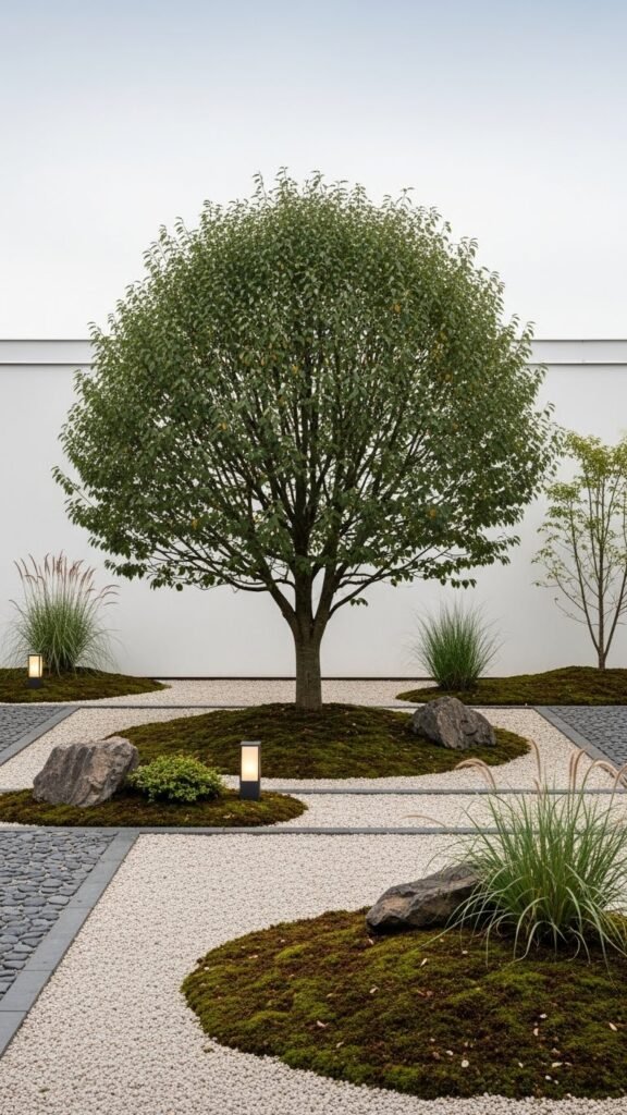 For a simple, uncluttered design, surround your tree with gravel, moss, and a few low-maintenance plants. This creates a clean look with modern lines — perfect if you want a minimalist garden space.