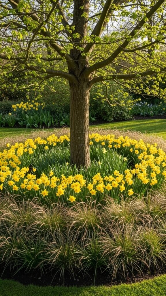 Plant daffodils and ornamental grasses in a neat circular layout around the tree for a fresh, spring-inspired display. The mix of bright yellows and soft greenery gives the area a vibrant yet natural feel.
