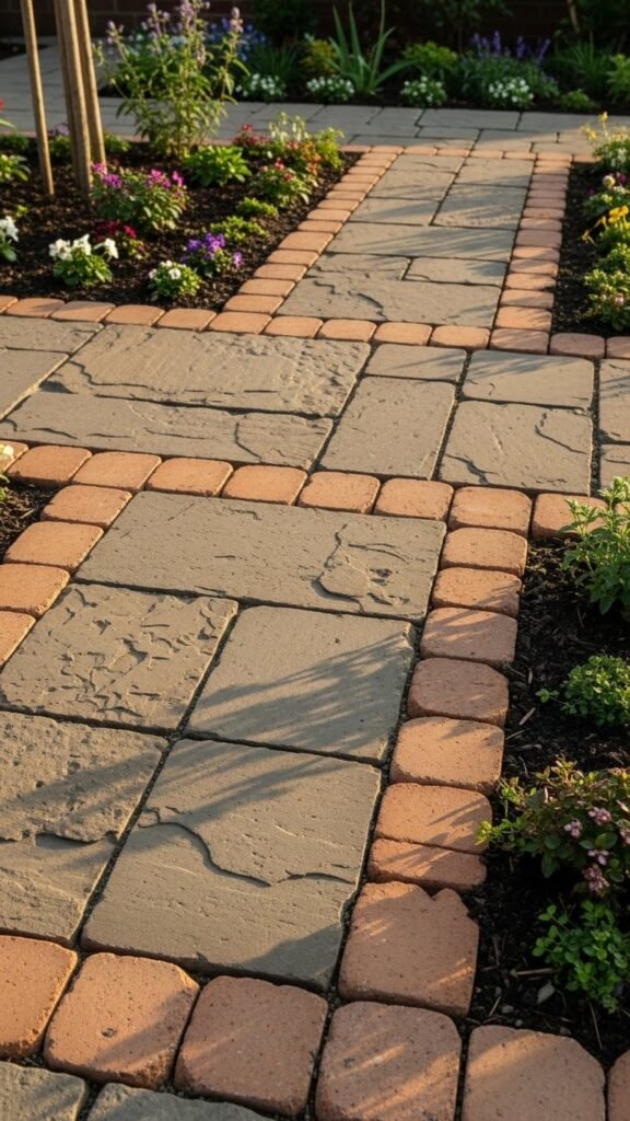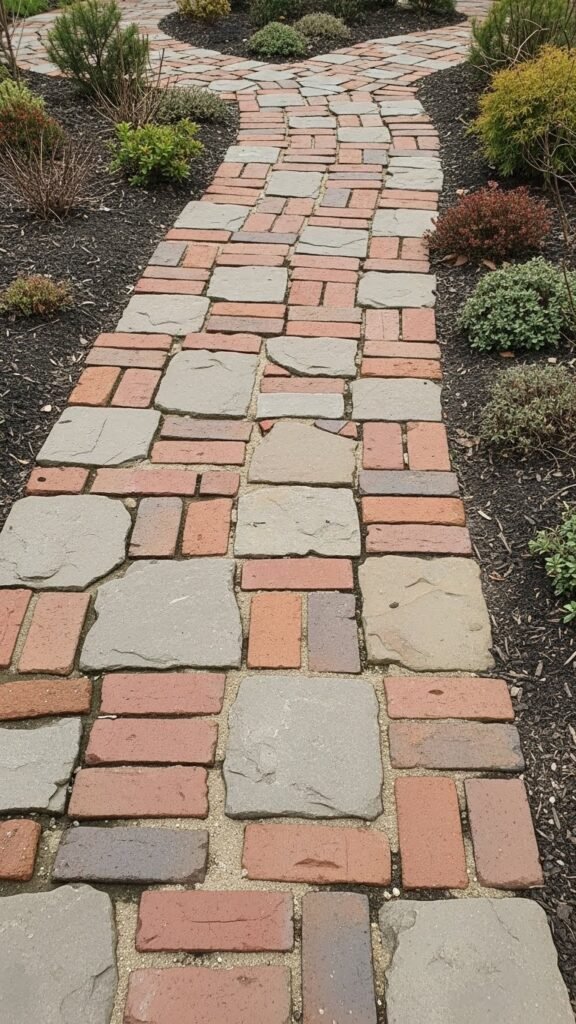 Combine bricks and stones to give your walkway structure and charm. Use stones for a natural feel and bricks for a tidy, defined border. The result is a versatile and balanced design that works in many garden types — and easy to customize with different colors or stone/brick choices.