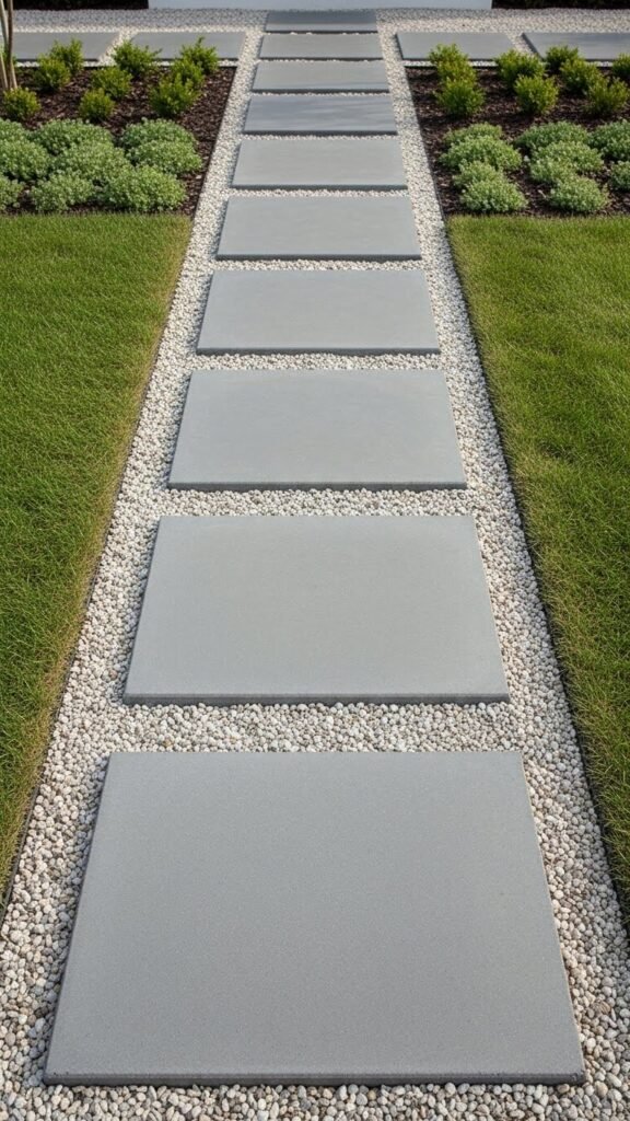 If you like modern simplicity, evenly spaced square stepping stones — with gravel or grass filling the gaps — give a neat, minimalist look. This style works well in contemporary gardens with clean lines and open spaces. It provides a subtle, yet structured path that guides movement in a calm, unobtrusive way.