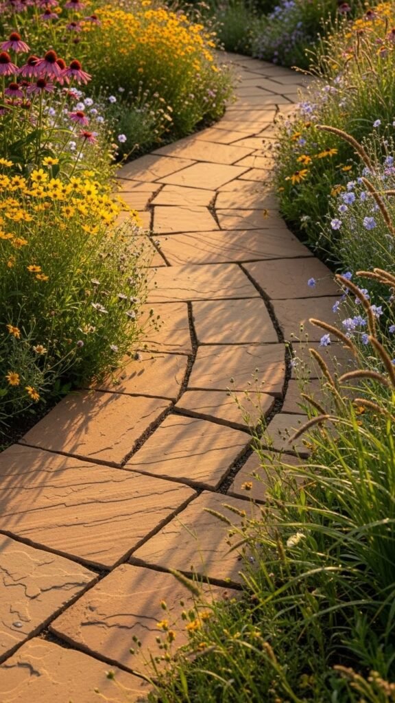 Sandstone flagstones, with their warm and natural color tones, look beautiful paired with wildflowers lining the edges of the path. This combination gives the walkway a soft, inviting, slightly rustic feel. Picking flat, sturdy pieces ensures safe walking, while seasonal wildflowers add color throughout the year.