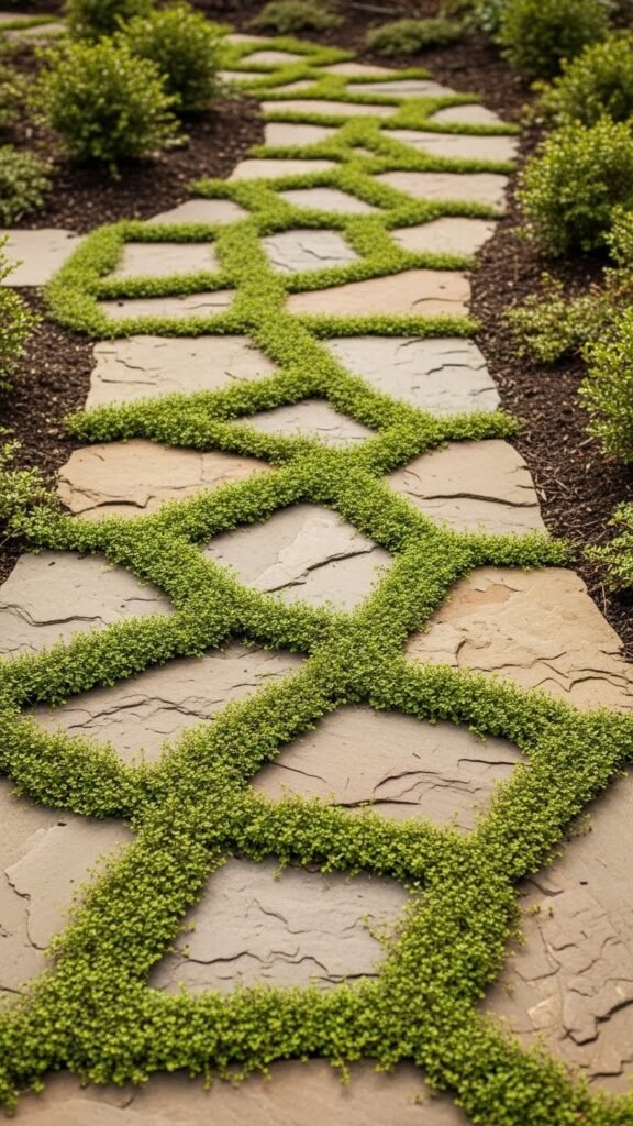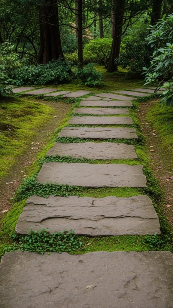 A minimal yet serene option: large, flat stones spaced apart so moss — or other ground-cover plants — can grow between them. This style suits shady or calm garden corners, where moss thrives. It offers a low-maintenance, peaceful pathway that blends seamlessly with greenery.