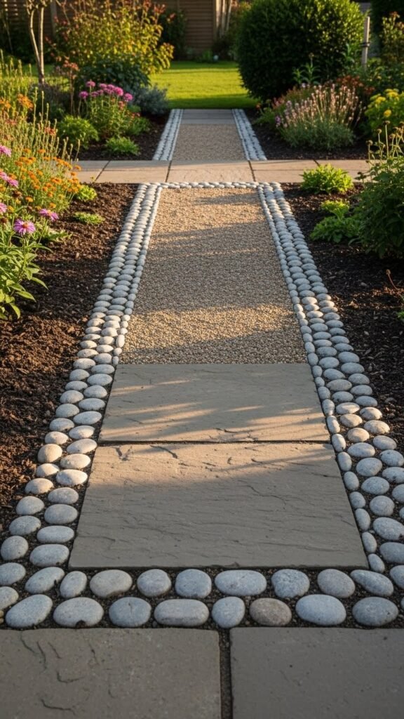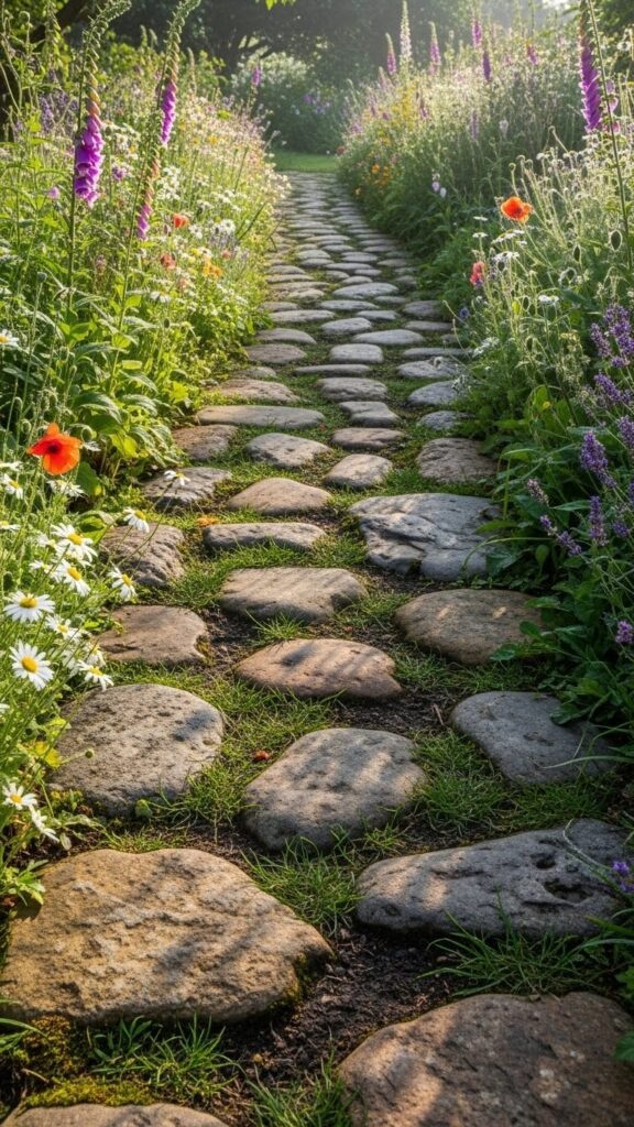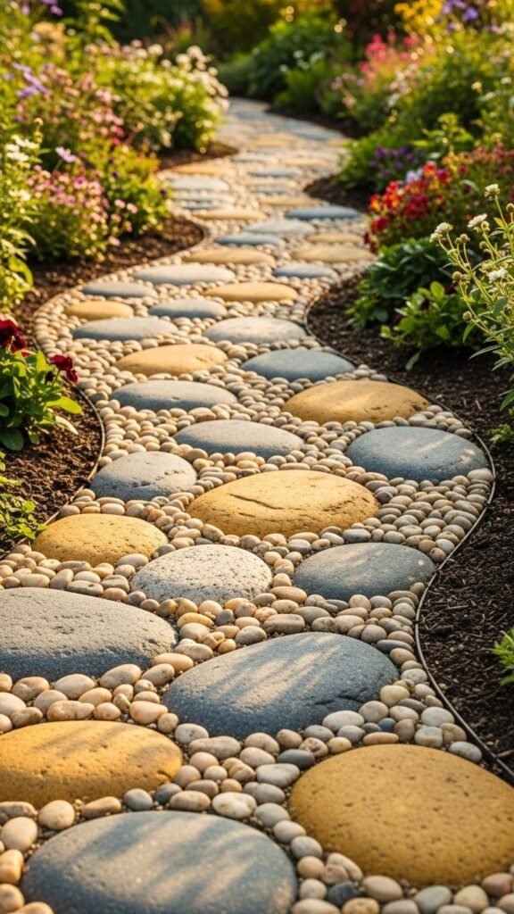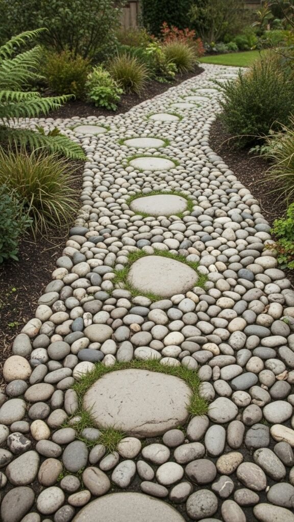 Smooth, rounded river stones of varying sizes can make a pathway that feels organic and rustic. Leave small gaps so grass or moss can sprout between them — giving the path a “part of nature” vibe. This style is especially fitting in gardens with a wild, natural flourish.