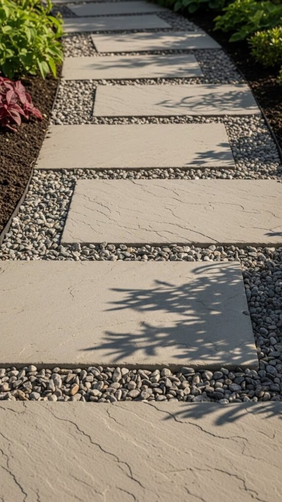 A classic, down-to-earth option: lay stepping stones on a bed of gravel. The gravel helps with drainage and keeps the stones stable. It’s an affordable, beginner-friendly design — ideal for a small garden path. Bordering the walkway with plants or flowers adds a warm, inviting feel.