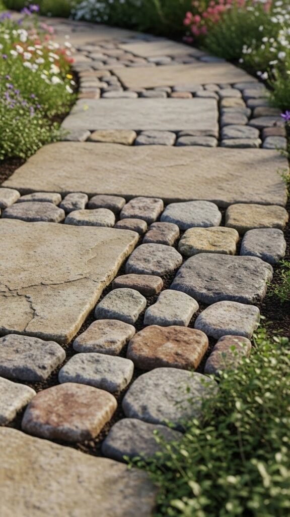 Mixing stones of different sizes — combining large flat stones with smaller, rougher ones — adds depth and texture to your walkway. This approach builds visual interest without complicated design work, and it brings a creative, organic feel to your garden path.