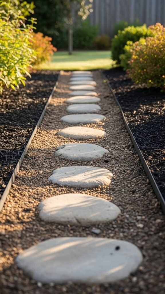 Laying flat stones in or across a dry creek bed — either vertically or horizontally — can mimic the feel of a natural water feature. Using darker stones against light gravel adds contrast and texture, giving your garden an organic, serene character. It’s a creative way to integrate landscaping features with your walkway.