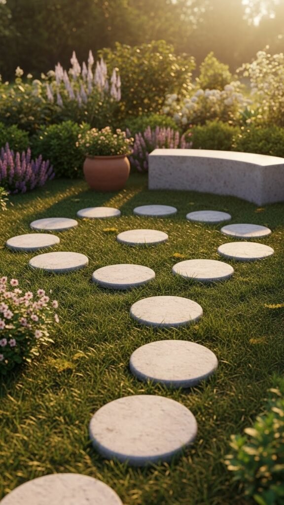 If you want something different from straight or curved paths, consider circular stepping-stone zones. These use round or curved stones arranged in patterns to create cozy pockets in your garden — perfect for small sitting areas or resting spots. This design softens harsh lines and adds a playful rhythm to the garden layout.