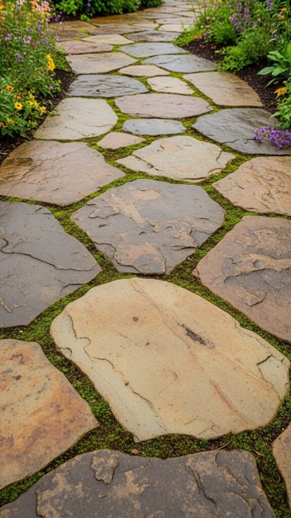 Using flagstones in irregular shapes creates a relaxed, natural look. The stones don’t need to fit perfectly together — which actually enhances the charm. Mixing different sizes and shapes adds visual interest. You can even fill the gaps with moss or ground-cover plants for a softer, garden-integrated feel.