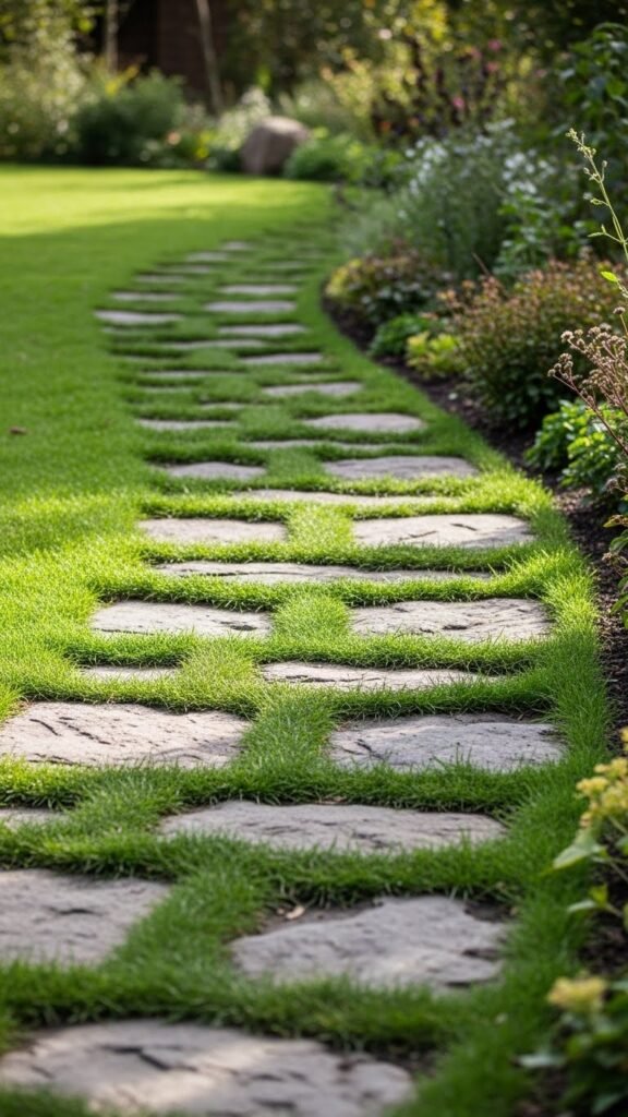 For a soft, natural vibe, try a gently winding stone path with grass growing between the stones. The curves lead the eye (and feet) naturally through the garden, and the green grass adds a fresh, organic touch. This style tends to blend beautifully into a wide range of garden themes.