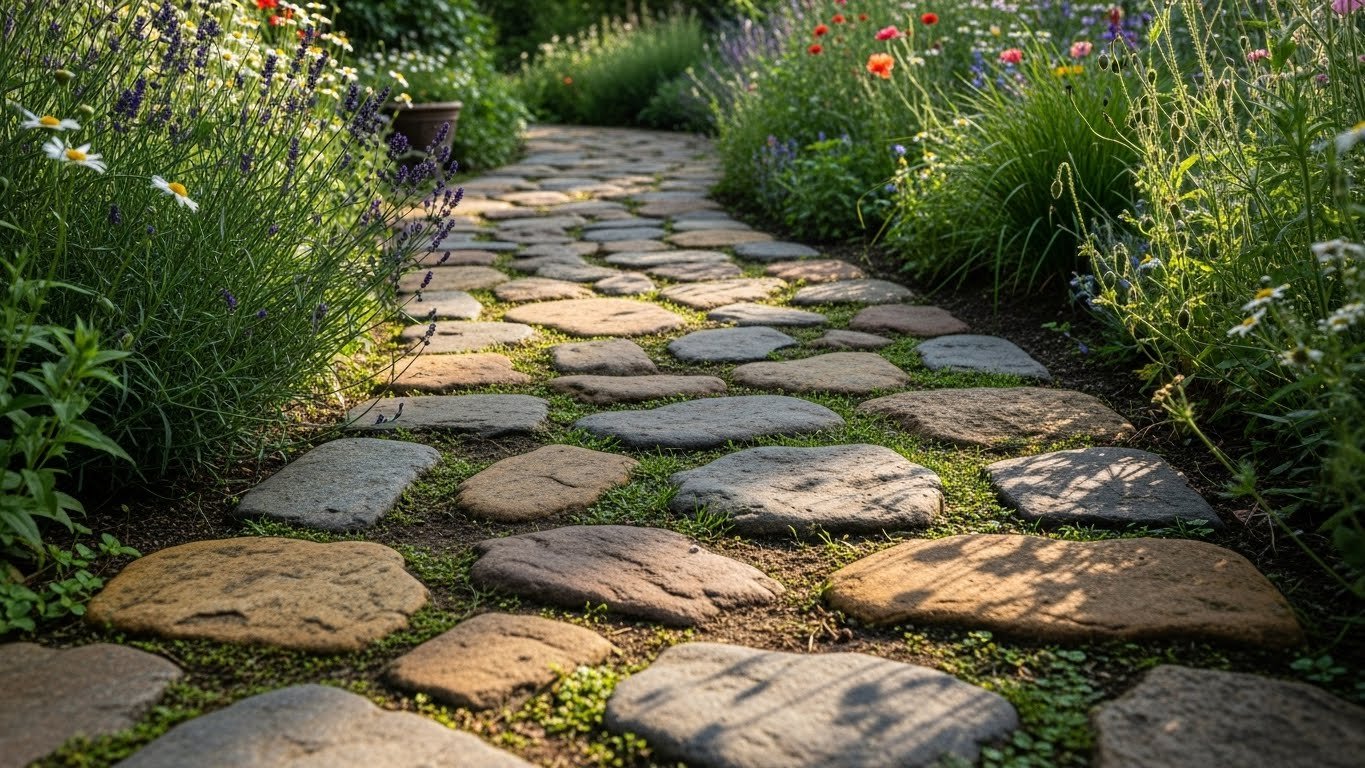 Mixing stones of different sizes — combining large flat stones with smaller, rougher ones — adds depth and texture to your walkway. This approach builds visual interest without complicated design work, and it brings a creative, organic feel to your garden path.